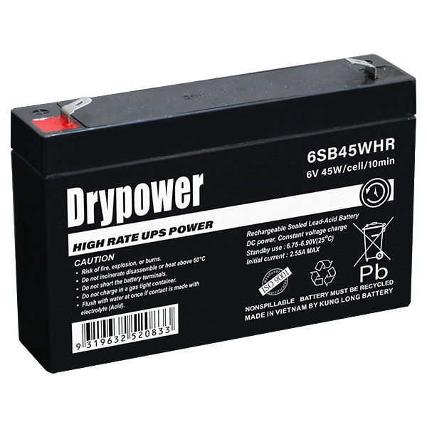 | Description | Drypower 6V 45W/Cell (10min) Sealed Lead Acid High Rate Battery for Standby and UPS Replaces Panasonic UP-VW0645P1 |