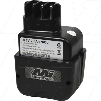 Metabo ABE9.6, BE A9.6, BE AT9.6, BE AT100, HLA15, EA150, EA100, Sr A60, StEPA140, Ta A1960, Metabo 630072, 6.3007, 6.31721, 13315449000, 31178, 52042954 000, 51854020 000. Voltage: 9.6v Chemistry: Ni-Cd Capacity: 2.5Ah !! Contains quality high rate Japanese cells for extra power and long life Important note to our customers on Cordless Drill Battery replacements. ...know what you are buying! Our complete Cordless Drill replacement range of batteries contain premium High Rate Japanese cells. These cells are designed to withstand the very high rates of discharge current and intense cyclic use demanded from trade quality tools. Be assured, cheaper imitations containing unknown cells, will be short on cycle life and poor in overall performance. This is one application where cell quality counts For more information on this subject, please see our Battery Information link under the Information section of our website. This battery is a fully compatible alternatve to the original branded product