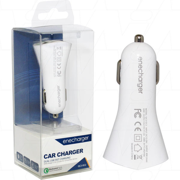 Dual USB 30W max. output car charger with 1 x QC2.0 fast charge port PLUS 1 x 2.4A high current port. The latest power supplies and products from Enecharger feature integrated Quick Charge 2.0 (QC2.0) technology inside made to suit the modern fast paced lifestyle. With Quick Charge 2.0 technology, you can now charge a typical 3300mAh smartphone battery from 0% to 60% capacity in as little as 30 minutes - that's up to a whopping 75% faster than conventional chargers! Don't have 30 minutes? Even in just 10 minutes it will charge from 0% up to 25%. This charger also charges Apple iPhone 6 / 6 Plus and 6S / 6S Plus up to 240% faster than conventional chargers. Ideal for use with QC2.0 enabled devices from major brands including Asus, HTC, LG, Motorola, Samsung, Sony, Xiaomi and ZTE. Enecharger's QC2.0 adaptors and power supplies are also backwards compatible*, making them safe to use with non-QC2.0 enabled devices as well, including iPhones and iPads. To learn more about Qualcomm Quick Charge 2.0 click this link: Qualcomm Quick Charge 2.0 technology explained . *All USB charged devices can be charged safely with this charger however charge rates will differ and may be slower depending on the charge acceptance of the device. Qualcomm® Quick Charge™ 2.0 Technology inside Ultra Fast Charging for Mobile Devices |