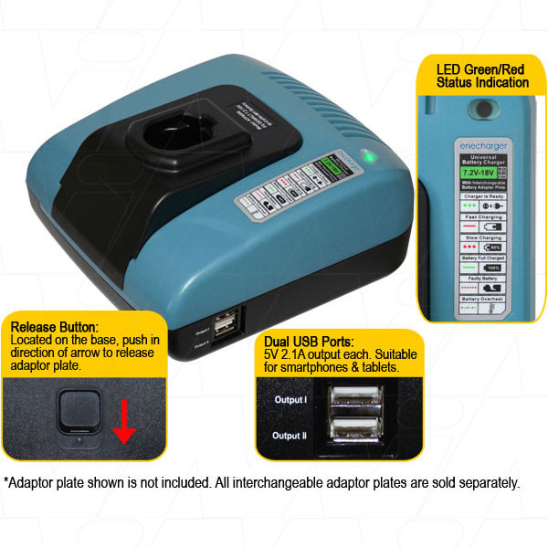 • Interchangeable adaptor plates (sold separately) to charge a variety of powertool batteries from different brands. See below to view the range of adaptor plates.