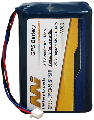 Application GPS devices Original Brand VDO Dayton Chemistry Lithium Ion (LiIon) Voltage 3.7V Nominal Capacity 2000mAh Brand Master (this product is a compatible alternative to that of the original brand) Width 33.8mm Height 10.08mm Length/Breadth/Depth 53.2mm Weight 42g Suitable For: VDO Dayton MS2010AUS Compatible With: VDO Dayton ICP1034501S1PSPM Comments This battery is suitable for VDO Dayton MS2010AUS GPS device. Replaces battery model ICP1034501S1PSPM.
