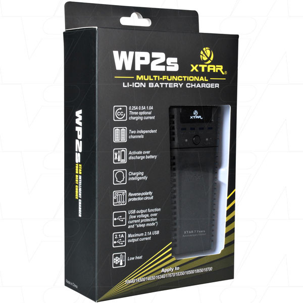 | Comments | XTAR WP2s 100-240VAC (World Voltage) / 12VDC input independent channel 2 cell lithium ion battery charger. - Comes with SAA, MEPS approved 100-240VAC (world voltage) to 12VDC input power adaptor plus 12VDC input cigarette light connection car plug.