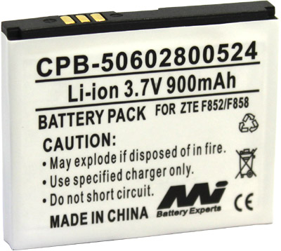 Application Cellular Telephone Original Brand ZTE Chemistry Lithium Ion Voltage 3.7V Nominal Capacity 900mAh Brand Master (this product is a compatible alternative to that of the original brand) Width 45mm Height 5.7mm Length/Breadth/Depth 37.4mm Suitable For: ZTE F852 ZTE F858 Compatible With: ZTE 50602800524